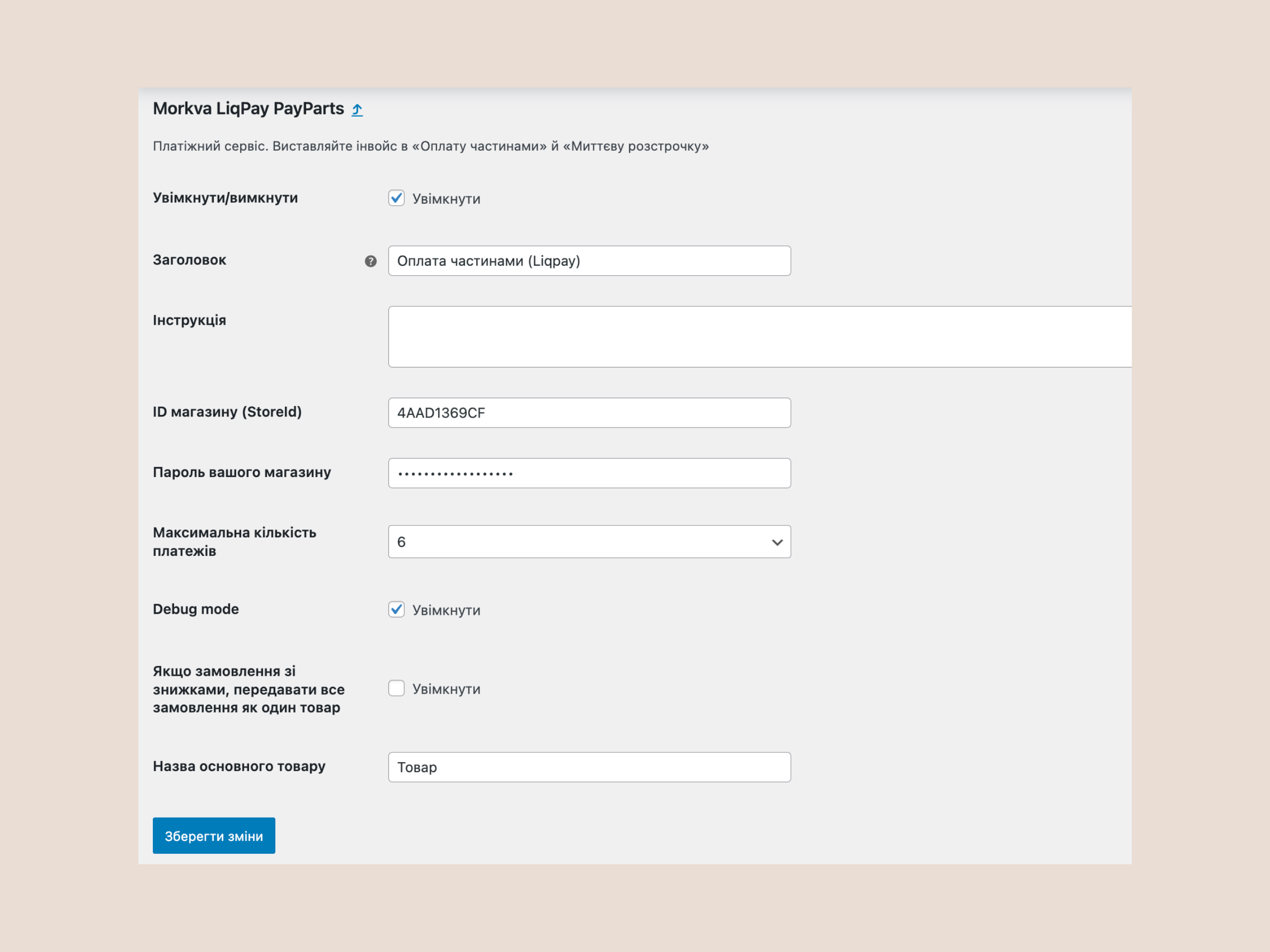 Для налашування Оплати частинами в плагіні, отримайте від свого менеджера Приватбанку StoreId та Password.